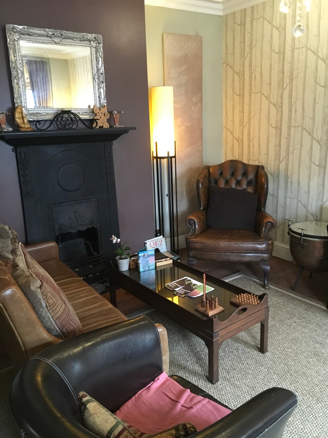 We’re first down to breakfast, which is in a cosy dining room split into two – part food area and part lounge, with a beautiful stained glass window, leather sofa and log fire.